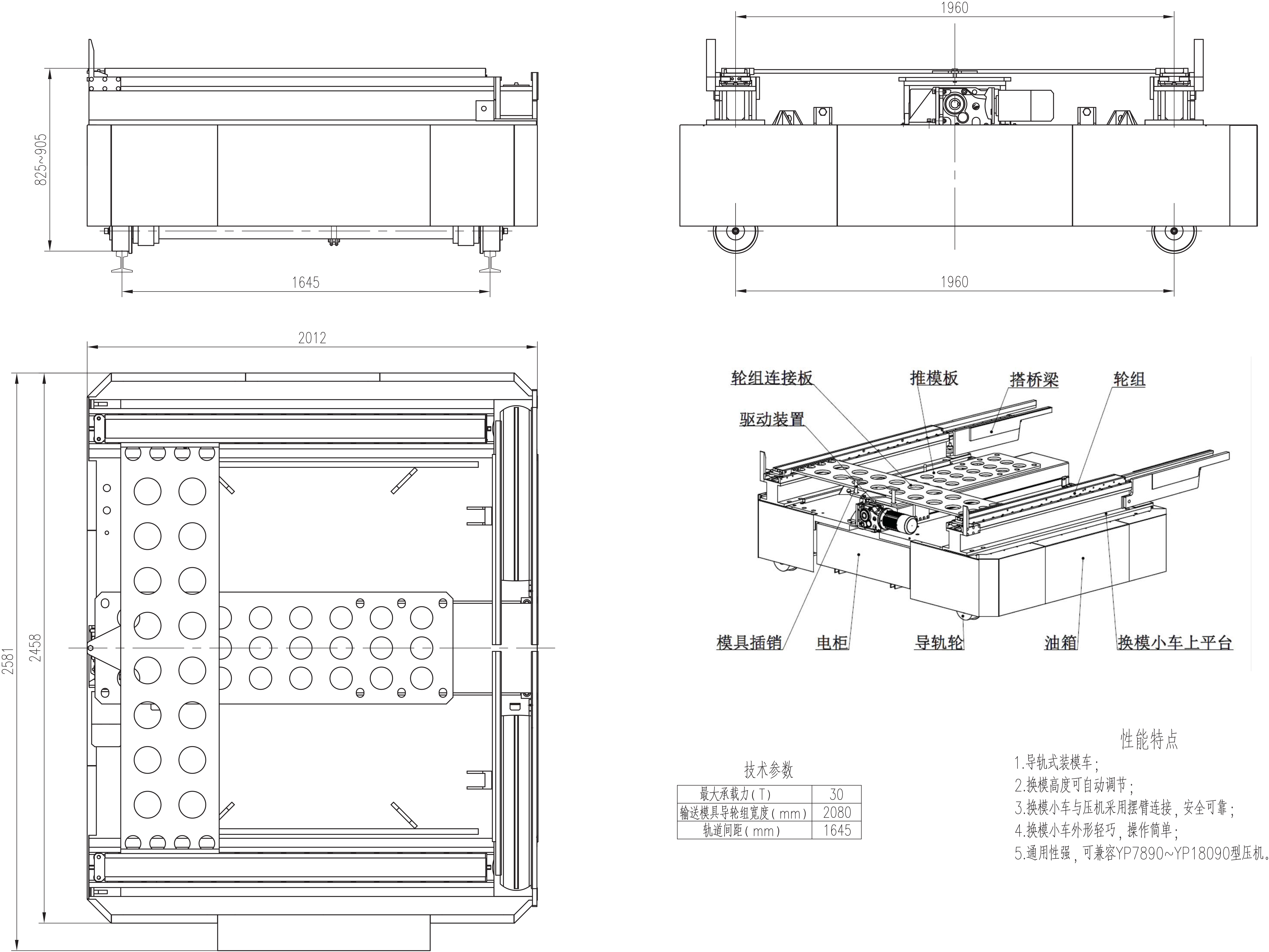 1.導軌式裝模車; 2.換模高度可自動調節; 3.換模小車與壓機采用擺臂連接,安全可靠; 4.換模小車外形輕巧,操作簡單; 5.通用性強,可兼容YP7890~YP18090型壓機。